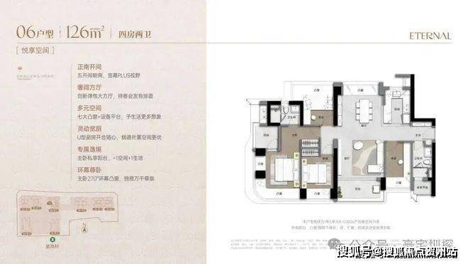 173m²的4房2厅3卫+家政间,竖厅类双龙抱珠格局,独立电梯厅入户约8.13㎡,客厅5.55米开间,LDKB一体化设计,主卧套房270°环幕凸窗+私享阳台,八大凸窗+设备平台+家政间,U型厨房,公卫三段式干湿分离。阳台正北朝向看会展中心+市民广场,得房率76%(不含赠送,套内面积131.98㎡)。