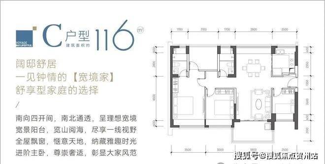 116㎡的4房2厅2卫,C户型,设计的是竖厅南北通透格局,客厅3.8米开间,四开间朝南,4个卧室分别做到了主卧17.85㎡/次卧11.4㎡/次卧9.3㎡/次卧8㎡(包含墙体飘窗),得房率约:93.13%(包含赠送),阳台主朝西南、东南或正南向。