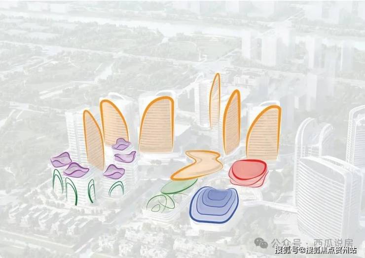 作为文化休闲目的地,设计从自然环境中汲取灵感,以诗意的建筑轮廓诠释南方园林,各主题场馆和文化工作室低层建筑布局犹如锦簇的花团,而皇家马德里足球世界和汽车主题体验馆的独特造型,如同绿茵中的白马蹄莲与红菊花,周围的高层办公塔楼如同翩翩蝴蝶。