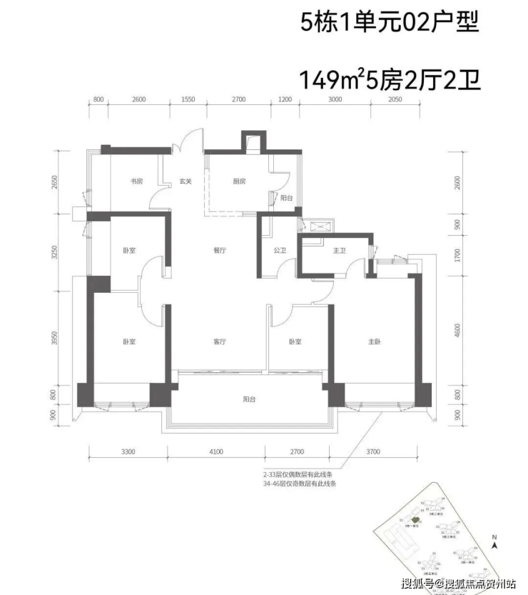 149㎡5房2厅2卫(43套)单价6.39-6.56万/㎡,总价区间955-981万;