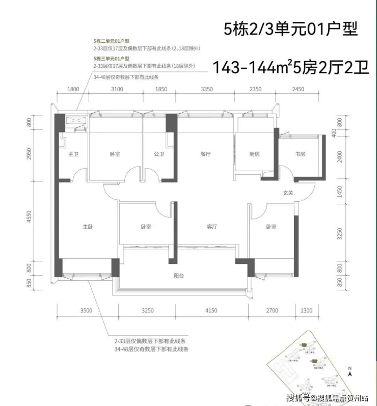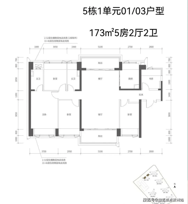 【五栋一单元-平面图】3梯3户,3条腿,分别是01、03号房户型约173㎡的5房2厅2卫、02号房户型约149㎡的5房2厅2卫