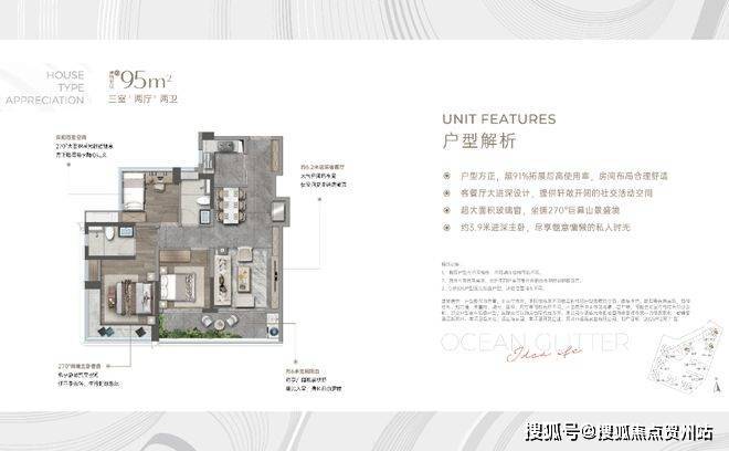 另外采用了大阳台、全尺寸飘窗以及270°转角飘窗等设计,充分发挥采光通风和扩展视野,体现自然、宜居、放松的产品理念。