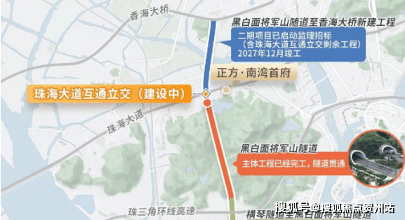 未来周边小区业主即可在该区域完成调头,避免了绕行前行调头的问题,黑白面将军山隧道至香海大桥:2024年10月16日,官方公布了该段及珠海大道互通立交剩余工程的招标信息,计划2027年12月竣工。