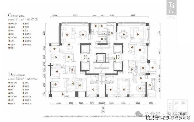 330平户型动静分区,独立入户玄关。57平餐厨空间,奢华感十足。近60平主卧,空间阔绰,设有独立衣帽间。一次卧有景观阳台,景观视野好。314平户型将观景阳台设在主卧,主卧功能布局完备。两个户型餐、厨、客厅连成一线,动线合理。