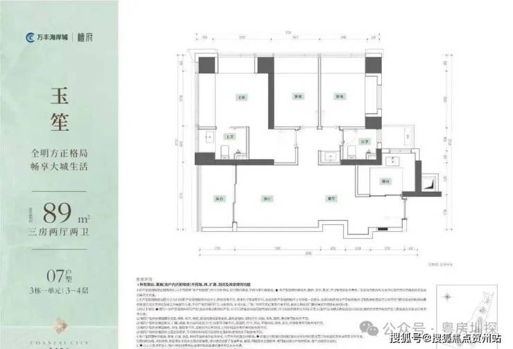 89㎡的3房2厅2卫,设计的是竖厅格局,客厅3.375米开间,LDKB一体化,S墙设计预留冰箱卡槽位,三开间朝南,动静分区,U型厨房,公卫三段式干湿分离,得房率约95%(包含赠送),阳台5.9m²西南朝向。赠送面积约14.69m²。