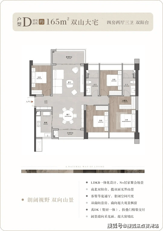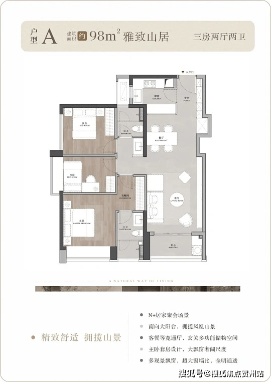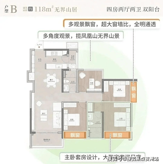户型均采用 LDKG 一体化设计,多为南北通透、双阳台布局,98㎡户型配备 5.8 米巨幕窗,采光观景俱佳。