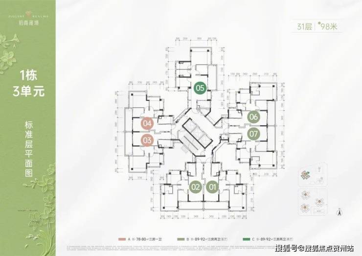 该户型分布在1栋三单元西北两条腿,在选房策略上可以优选03,侧朝向西南日照时间更为充分,不过这条腿几乎售罄了,整个78-80㎡户型都非常抢手。