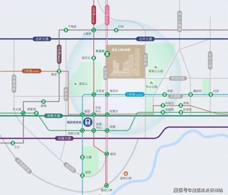 无缝接驳地铁10号线冬瓜岭站,纵享福田“一中枢、双口岸、四核心”枢纽体系,再造引桥匝道升级微循交通体系,高效互联湾区城市与全球资本。