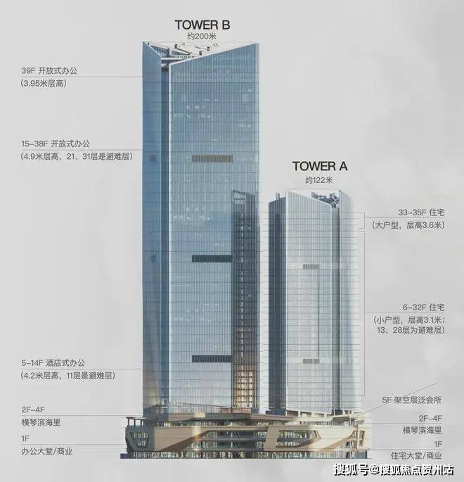 项目产品:楼高 122 米,共 35 层:裙楼商业( 1-4 层);架空层泛会所(5 层)