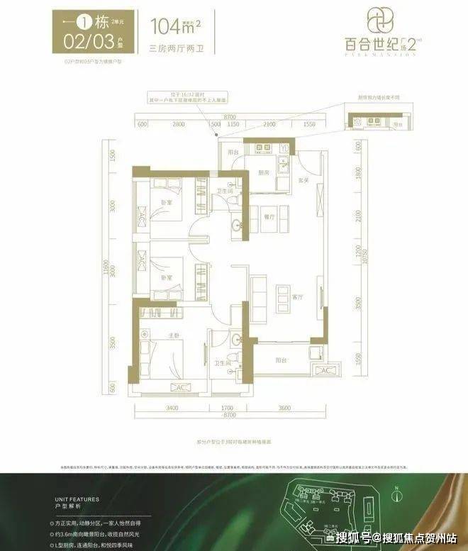 1栋02/03户型,设计的是竖厅格局,客厅3.6米开间,LDKB一体化设计,三开间朝南,动静分区,正南朝向。