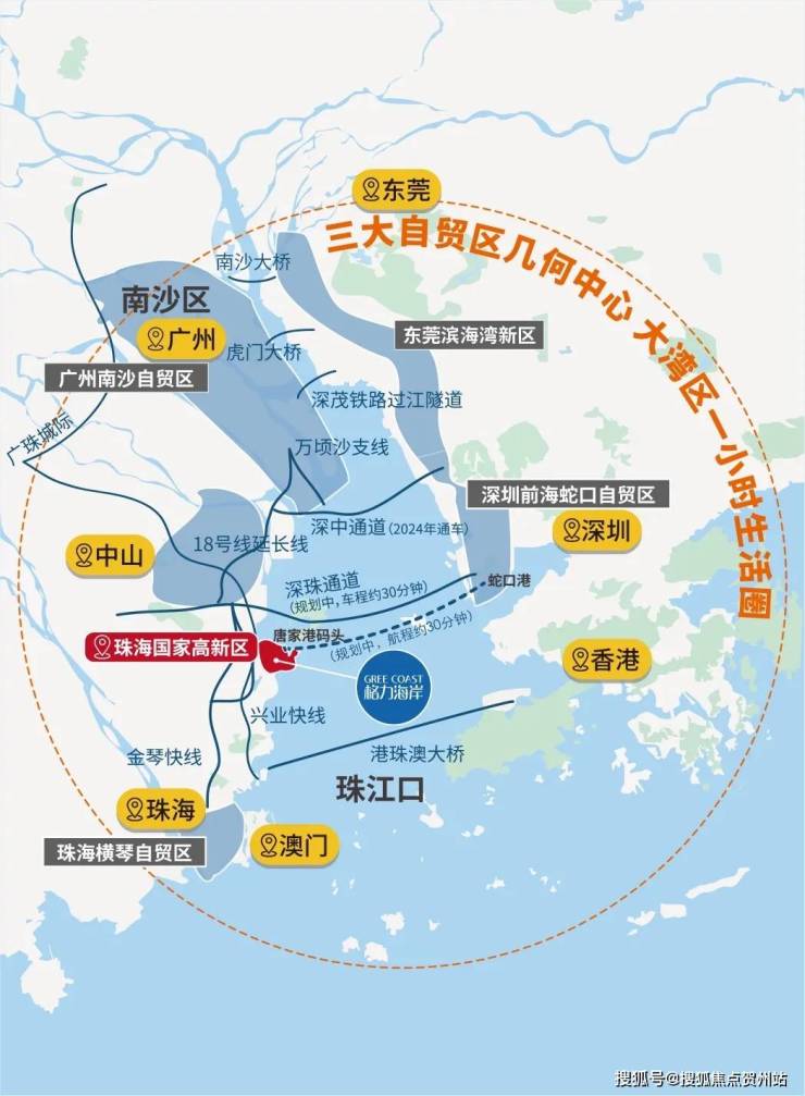格力海岸所在的唐家湾,地理位置得天独厚,占定三大自贸区几何中心(深圳前海自贸区、广州南沙自贸区、珠海横琴自贸区)。且以大桥未支点效应,多维交通路网向外延展:港珠澳大桥、深中大桥(建设中,预计2024年通车)、金琴快线、兴业快线(建设中)、唐家港码头(计划开通到蛇口新航线)、广州地铁18号线延长线(规划中)...,未来将形成大湾区一小时生活圈,接轨世界前沿。