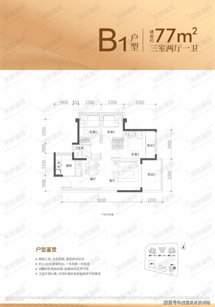 77㎡的3房2厅1卫,设计的是竖厅格局,客厅3.3米开间,进深8.2米,LDKB一体化设计,3个卧室分别做到了主卧11.3㎡/次卧7.28㎡/次卧7.28㎡(包含墙体飘窗),U型厨房,卫生间三段式分离,得房率约88.31%(包含赠送),东南朝向。