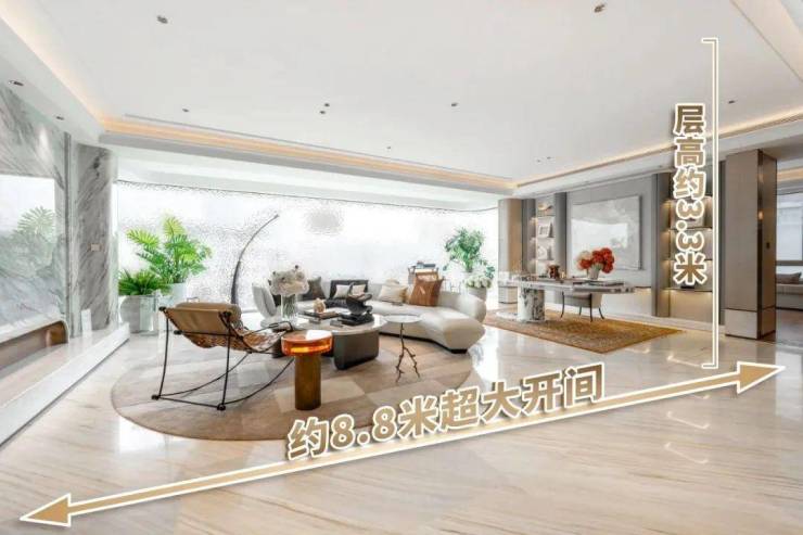 我们来看建筑面积约190平米的四室两厅三卫户型。打开曲线浮雕装甲门,首先是一个非常实用的800库储藏间。进入客厅,你看到的是约9米长的超宽阳台,再加上带有弧面转角的超大玻璃窗,让客餐厅更显敞亮。更高含金量的「客餐厨LDK一体化」,来自于厨房的超长岛台设计。