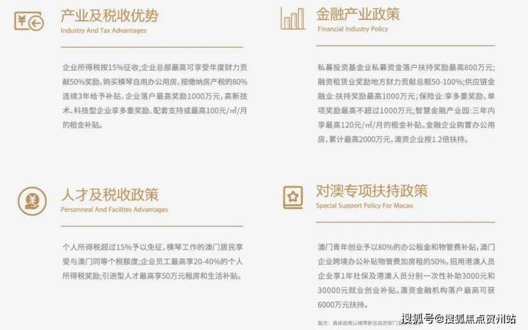 4. 全方面的优惠政策:加速促澳经济适度多元发展,从总部经济、产业培育、对澳专项扶持、金融产业、人才补贴五个方面对企业和人才进行奖励和扶持,如:企业进驻奖励、办公租金补贴、个人所得税奖励。