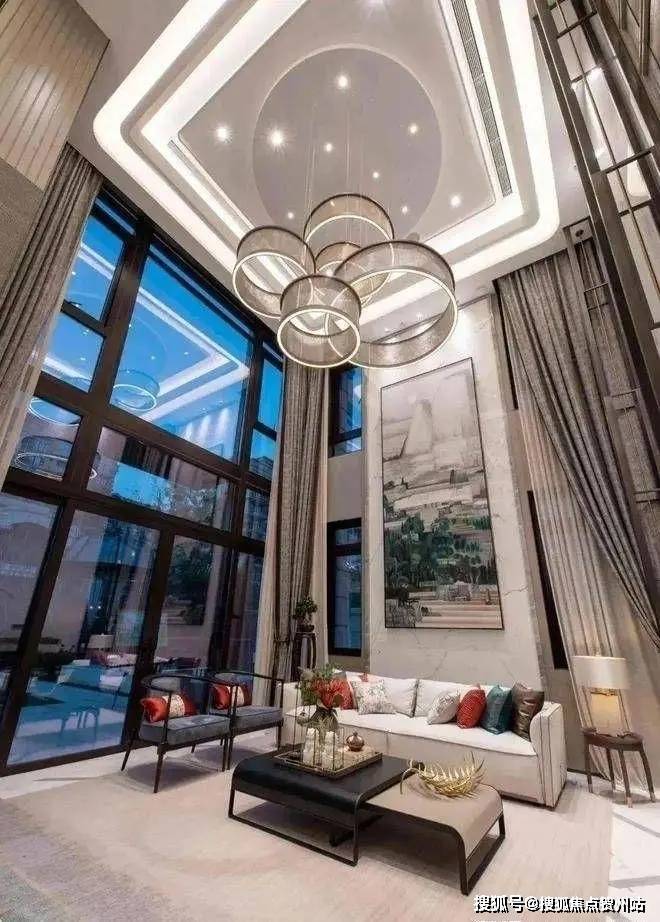 以约620-693㎡的样板房为例,设计为地上3层+地下1层,地上每一层层高达到3.6米,客厅挑高7.2米,开间做到了11.3米。