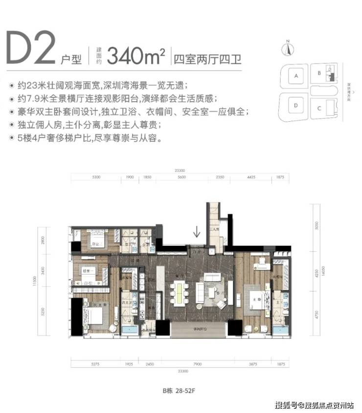观景阳台:高区340平米户型,东面23米宽无敌海景视野(塔楼总观景面约46米)