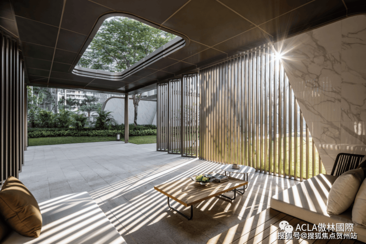 绿景 · 玺悦湾以窗为眸,沿着营销中心的水景,可以在8米长的巨幅数字水幕前稍作停留来作为记忆点。视线穿过水幕还可以隐约看见里面郁郁葱葱楼王花园。