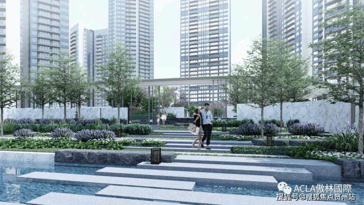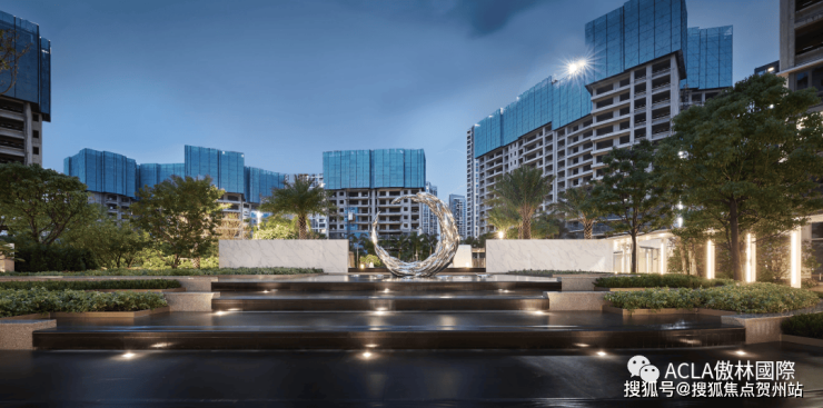 绿景 · 玺悦湾从玄关出来,可以由近而远看到楼王前的水景,连接着远处的主水景以及主景雕塑。