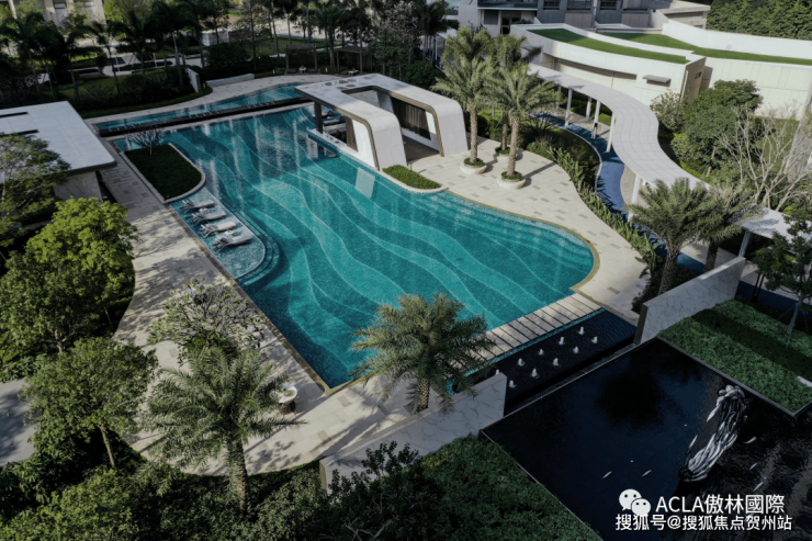 与泳池相连的跌水主水景,让访客用一望无际的视角来欣赏雕塑艺术品《乘风破浪》。