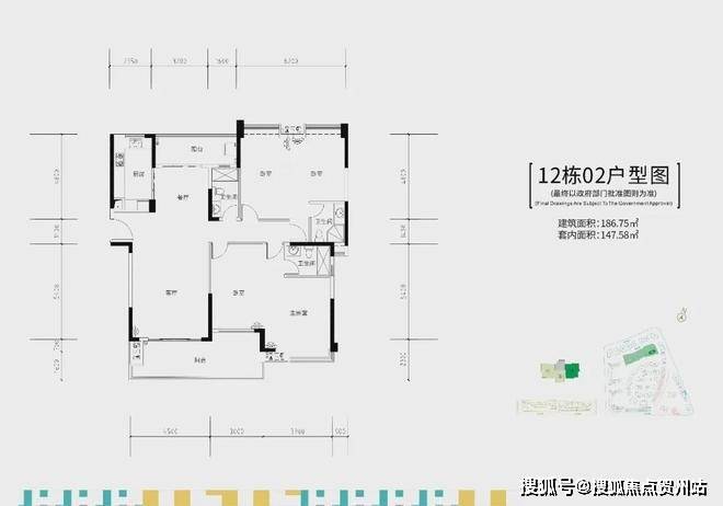 12栋两梯三户,建面约187㎡四房双套间户型。