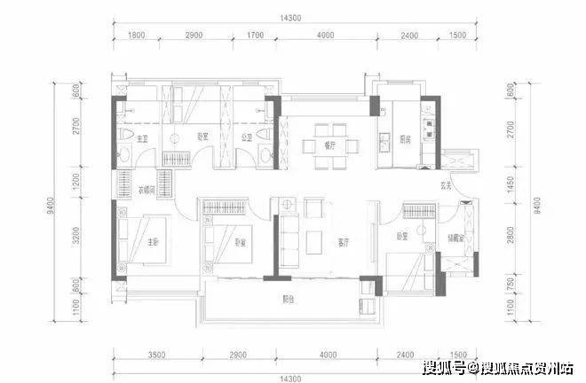 114㎡横厅四房两厅两卫,属于比较常见的设计方案,环窗飘窗设计增加了空间利用,但餐厨由于建筑结构也会有部分影响。