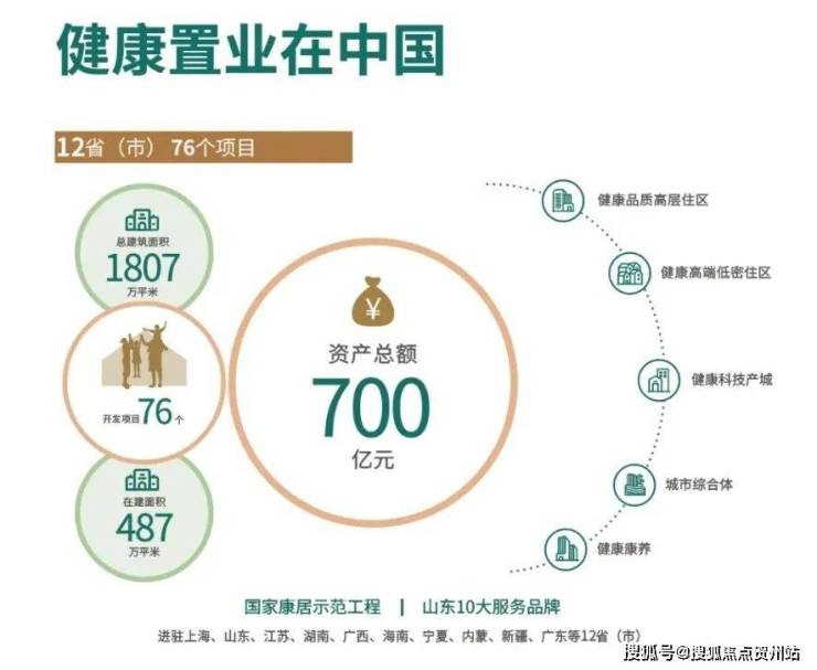 旗下健康置业进驻上海、山东、广东等12省(市),开发项目76个,荣获中国品牌房地产企业100强,省属国有企业中最大的康养地产开发企业等荣誉资质。打造国家康居示范工程,国匠实力,值得托付
