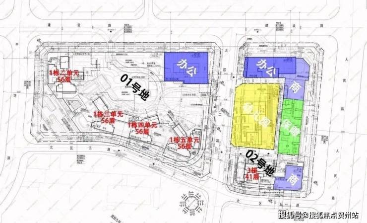 01-01地块,总占地面积约1.93万㎡,总建筑面积约23.8万㎡,计容建筑面积约18.01万㎡,容积率8.81,绿化率40.01%,共由4栋总高56F的住宅组成,1栋1单元办公40F,1栋2/3/4/5单元住宅56F,规划有公交首末站。