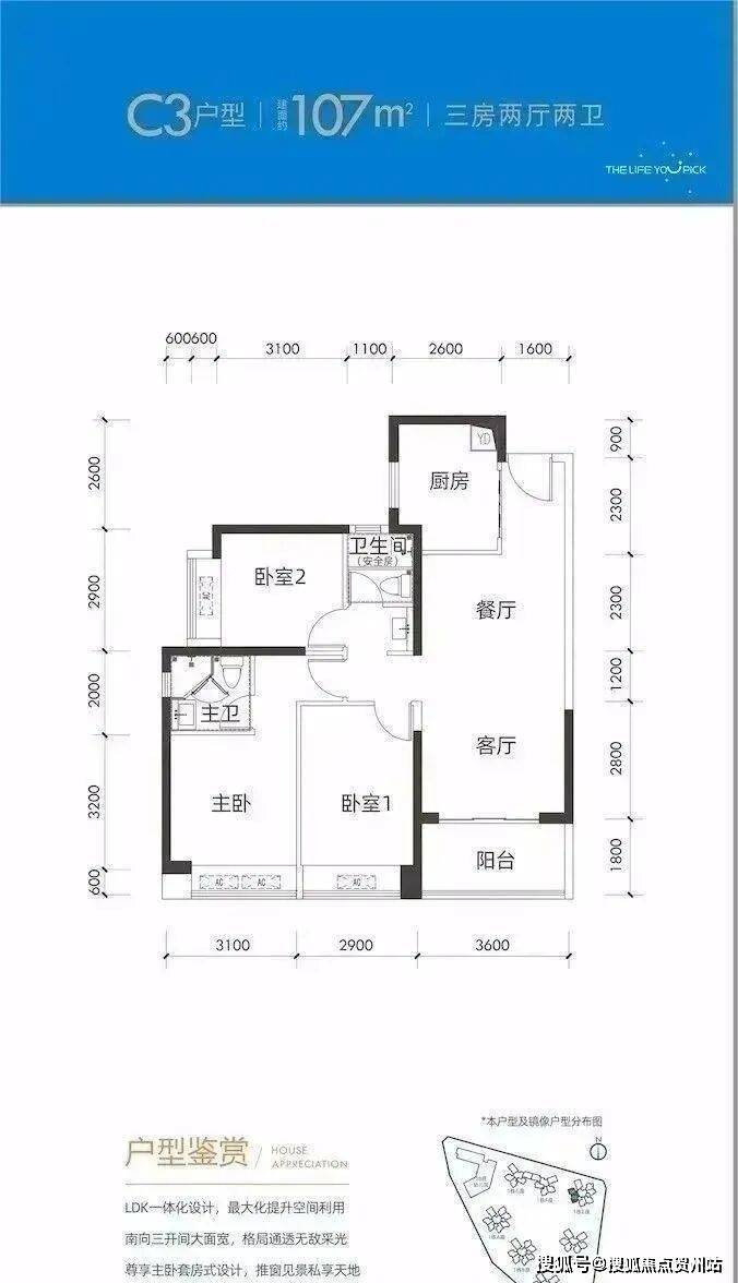 100㎡的3房2厅2卫,折后总价355万,单价3.55万/㎡。