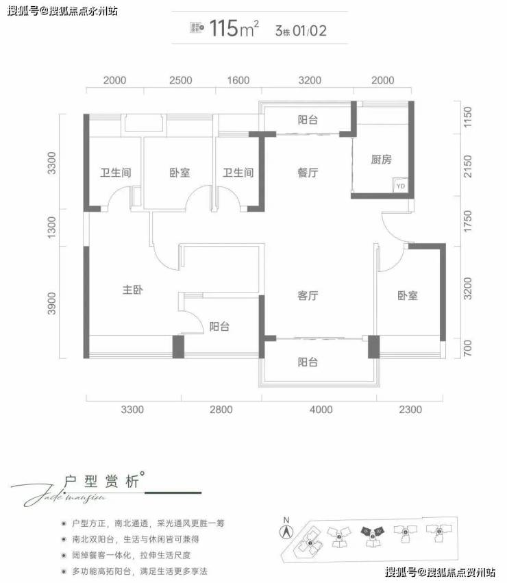115平3+1房2卫:这个面积段是套数最多的,有四条腿、有两个户型。3栋两条腿对称,一个东南、一个西南朝向;4栋两条腿都是南北通透。这两个户型设计和布局都还不错,