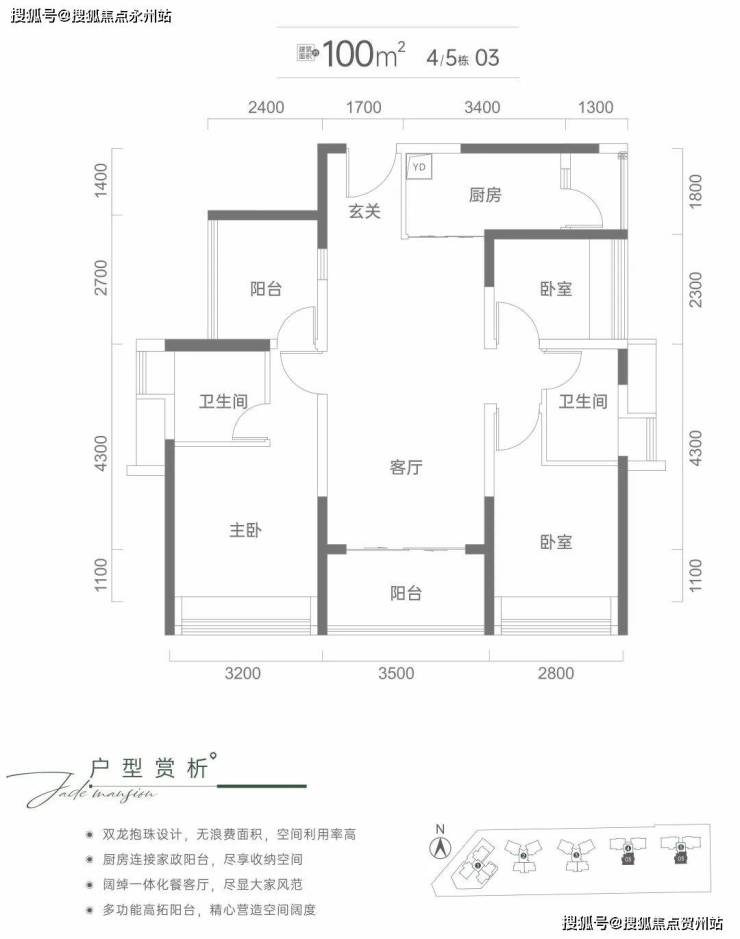 100平3+1房2卫:阳台一样可以改成次卧,做到4房,双阳台设计,南朝向,使用率也在78-79%左右,4房2卫,传统的竖厅户型,动静分区格局,传说中的‘双龙抱珠’户型,双阳台设计;这种户型设计很合理,卧室在客厅的两边,卫生间的布局也很科学,减少了过道,空间利用率特别高。主卧不包括卫生间大小为11.5平米,比较适中,不过朝东的卧室只有4平米左右,做成卧室稍小,比较适合做成书房或者储藏室;这个户型的厨房利用空间大很多,还带有一个生活阳台。