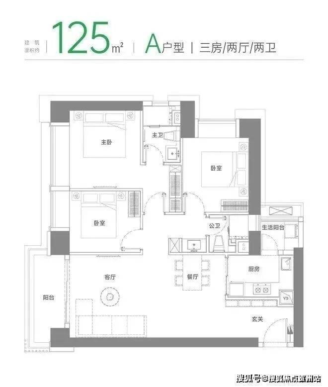 125㎡A 户型三房两厅两卫:为经典的三房两厅两卫竖厅设计,是货量最多的户型,有东南、西南等朝向。该户型飘窗、阳台设计可拉开居住视野,LDK 一体化设计打造了无边界、社交化的餐客厨系统。双阳台设计,厨房连通生活阳台,延展更多空间,便于收纳。