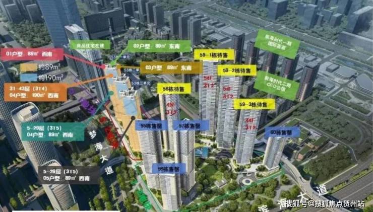 (1)89㎡三房两卫:共159套,是前海核心区域唯一在售小户型住宅,主打刚需及改善型购房需求。
