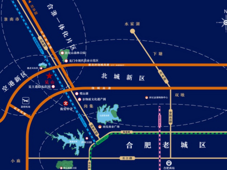 交通:自2017年10月25号项目至岗集C151和项目至合肥临泉西路的定制公交全线通车。合淮线/合淮阜高速公路/沪陕高速三大公路线,城际轨道交通S5号线均规划吴山镇站,地铁12号线串联合肥(规划中)。