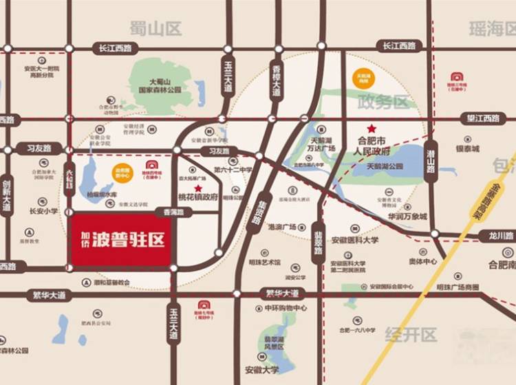 随着近年合肥政务区的大力发展,区域土地资源逐渐稀缺,发展需求外溢政务西南方向成为合肥整合发展的重中之重,本项目处于西南板块 ,发展 巨大。 景观——一山三湖,立体交通 加侨波普驻区位于西南 核心 合肥绿肺——大蜀山森林公园, 同时处于天鹅湖、北雁湖、蜀西湖中间位置,一山三湖,自然环境优美! 交通——立体交通,四通八达 项目周边道路四通八达,玉兰大道、集贤路、习友路、明珠大道、繁华大道多条城市主干道环伺。