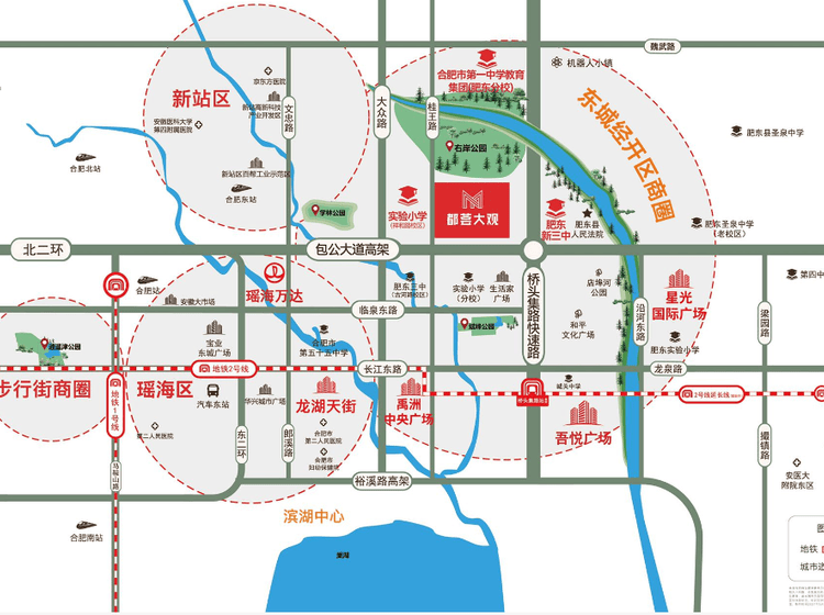 距离肥东高铁站仅4.5km;距离京台高速的肥东出入口仅5km;沿桥头集路向南直达裕溪路高架口