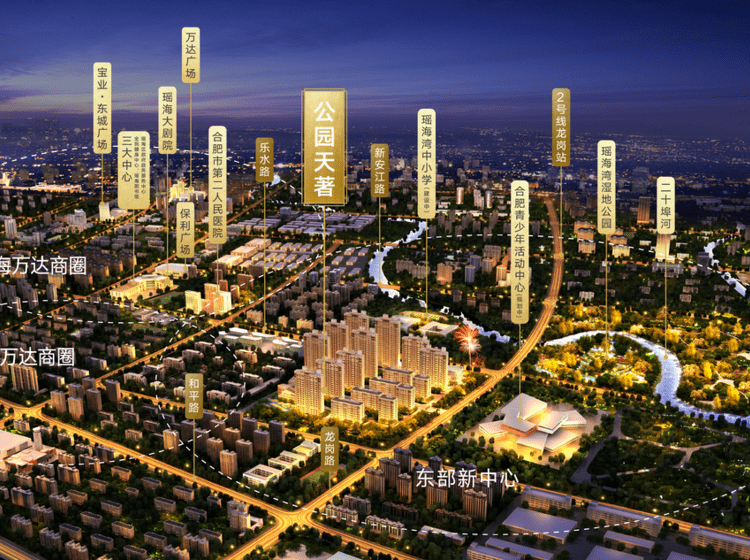 公园天著项目地处合肥东部建设新中心 , 紧邻瑶海湾湿地公园和月亮湾公园,生态环境优越,交通便利,区域内配套完善,周边路网发达,高架+地铁双线交织的立体交通网 。郎溪路、裕溪路高架可快速到达合肥包河区 、蜀山区及政务区。地铁2号线离项目不到2公里 ,未来周边还规划地铁6号线。项目自建幼儿园,周边有马岗实验小学、初中五十五中以及高中十中新区,可享受家门口一站式教育服务资源。
