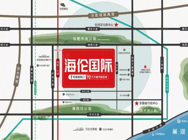 合肥海伦国际位于安徽省合肥市滨湖区锦绣大道与庐州大道交口东南角(地铁一号线,滨湖会展中心站A口),与地铁一号线滨湖会展中心站无缝对接,与骆岗中央公园仅锦绣大道一路相隔。项目紧邻会展中心经济圈、要素大市场等政府明星地标建筑。