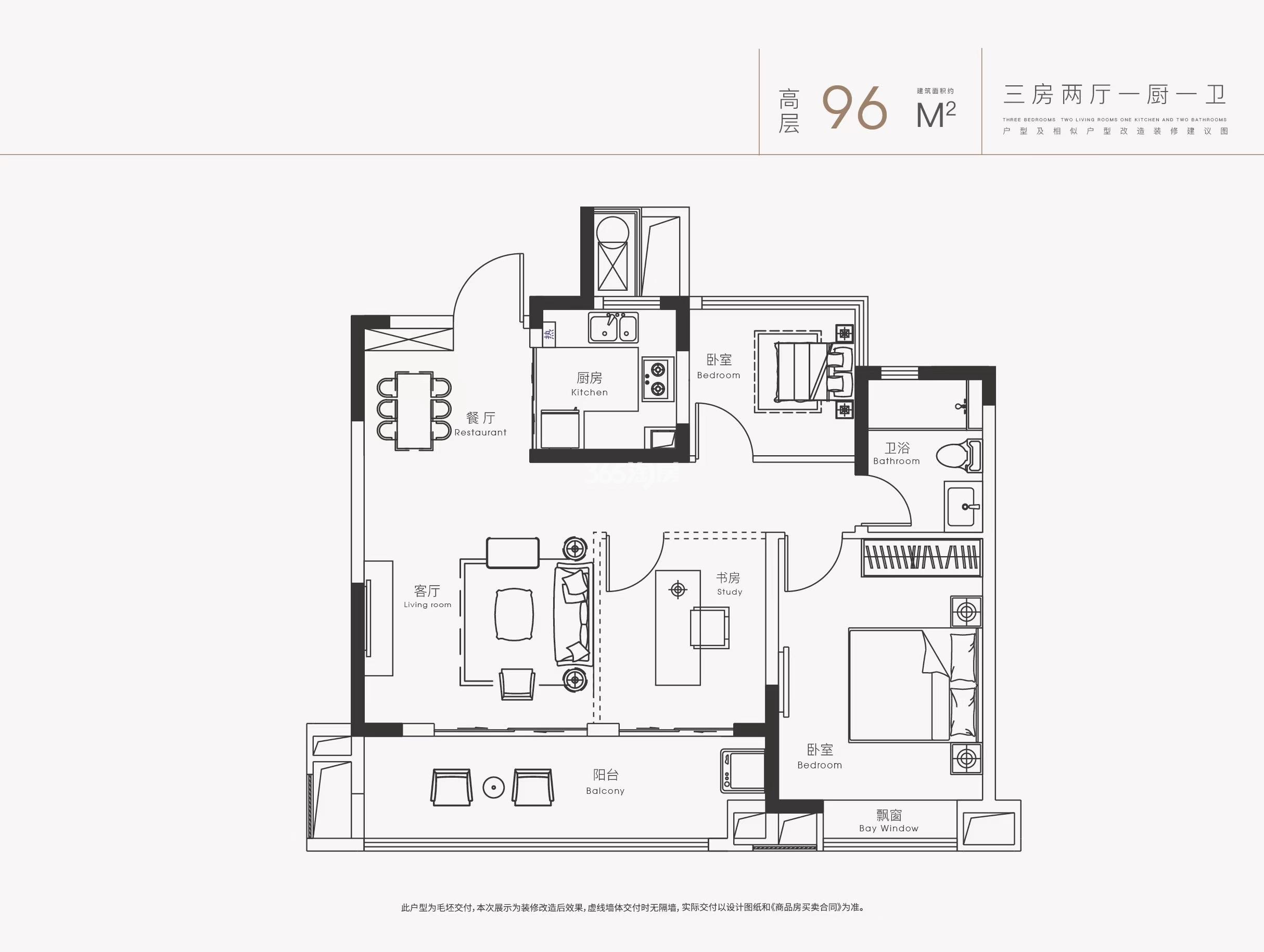 3室2厅1卫-96㎡户型-3室2厅1卫