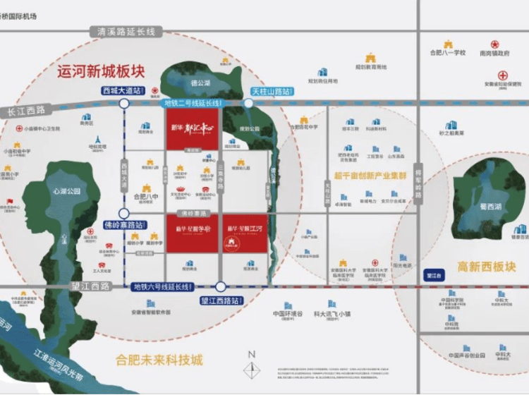 项目立足运河新城生态核心发展带,北邻江淮运河生态廊道(直线距离300米),南接运河新城政务服务中心,东望合肥西站枢纽辐射圈,西靠运河新城科创产业集群,既享板块规划的高端配套,又深度融合运河生态资源与新华本土人居洞察,定位为“运河芯·江河边·低密府院”,精准覆盖年轻精英、二胎改善家庭及高净值品质人群,实现全生命周期居住需求适配。
