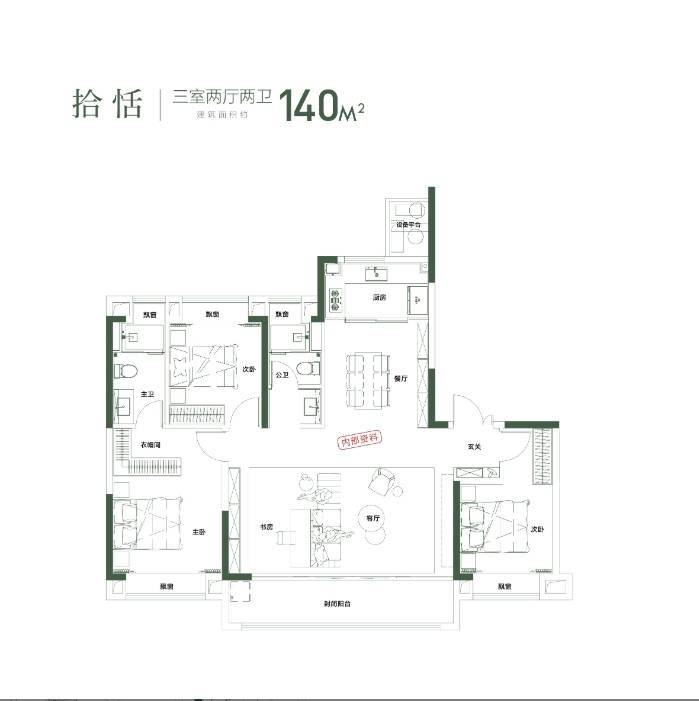 东侧次卧朝南,面宽 3.3 米,可作为老人房,采光通风俱佳,方便老人起居;西侧次卧朝南,面宽 3.1 米,可作为儿童房,空间宽敞,满足孩子成长需求;北侧次卧面宽 2.9 米,可改造为书房、琴房或客房,灵活性极高。厨房采用 U 型设计,操作台面长 3.5 米,洗切炒动线合理,与餐厅相邻,用餐便捷;餐厅空间开阔,可容纳 8 人餐桌,适合大家庭聚餐,增进亲情。双卫生间均采用干湿分离设计,公共卫生间位于次卧之间,使用便捷,避免早晚使用高峰拥挤。该户型空间奢阔,功能完善,能够满足多人口家庭的长期居住需求,是改善家庭的终极之选,在生态环境中享受高品质生活。
