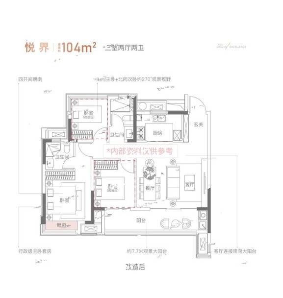 此外,该户型的私密性设计也值得称赞。阳台与次卧相连,客厅不直接看到阳台的晾晒衣物,主卧套房设计独立卫生间,保证了居住隐私。总体来说,这个户型适合三口之家或二胎家庭,没有明显的硬伤,是一个值得考虑的选择。