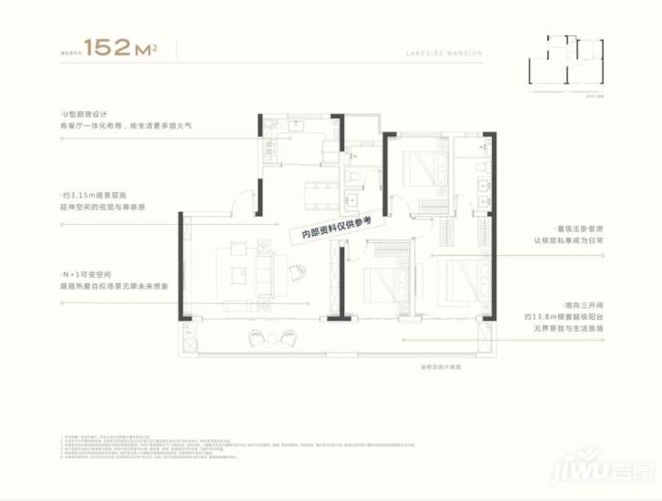 作为伟星玖峯汇的主力户型之一,152㎡户型同样为三室两厅两卫一厨的设计,但空间更为宽敞。该户型设计了u型厨房,实现了客餐厅的一体化,主卧可设置衣帽间,并配有景观阳台,让居民能够享受更为舒适宽敞的居住环境。