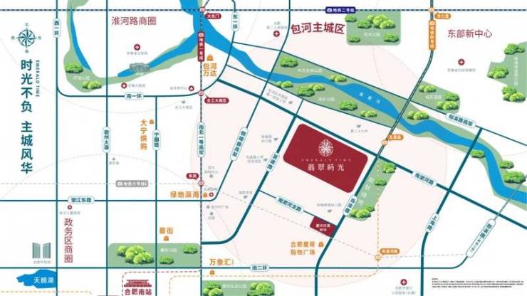 翡翠时光位于当涂路与南淝河路交口,东侧规划有约10万方的公园,北侧临近南淝河。交通便利,铜陵路高架、东二环直通南北,南二环、南淝河路连接东西,三线地铁环绕,生活便利。项目周边配套齐全,约2.5公里为半径的生活圈内,有星隆购物广场、百大购物中心、市中医院、市新三院等。此外,小区东北角还自建约8000㎡商业,为居民提供更多便利的生活服务。