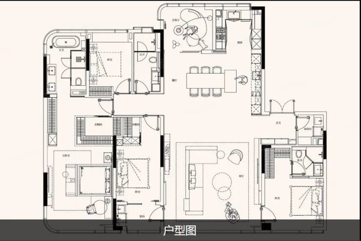 300平方米的户型达到了五室三厅四卫的规模,其中四个卧室加设了一个书房,三个卧室拥有独立卫生间。玄关处设置了独立的衣帽间,书房拥有阳台,可供放松心情或阅读。整体布局生活区在东侧,居住区在西侧,动静分明,为居住者提供了更舒适的生活空间。