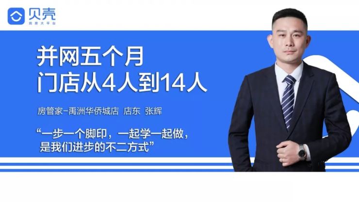 仅仅小半年的时间,张辉便实现了让店面人员从4人到14人的增长,这其中有他自己的秘诀。他和我们分享道:“我们店是今年六月并网的,那个时候门店只有三个经纪人,并网后我把招人、育人和留人作为门店的头等大事,招人这个环节要重点感谢总部贝壳平台的经纪人增长中心,门店有百分之八十的经纪人都是通过增长中心到店的,部分通过门店经纪人转介绍入职的。