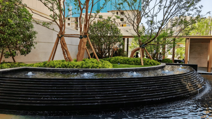 主题花园涵盖了芳香植物区、四季花卉区、原生绿植区等,种植了樱花、桂花、玉兰、海棠等多种名贵花草树木,四季有景、三季有花,春赏樱花、夏观荷塘、秋闻桂香、冬看雪景,让居者在社区内就能感受四季更迭的自然之美。生态湿地与雨水花园则采用生态可持续设计,通过水生植物、砾石层等自然元素实现雨水的渗透与净化,既打造了独特的湿地景观,又践行了环保理念,为社区增添了生态活力。
