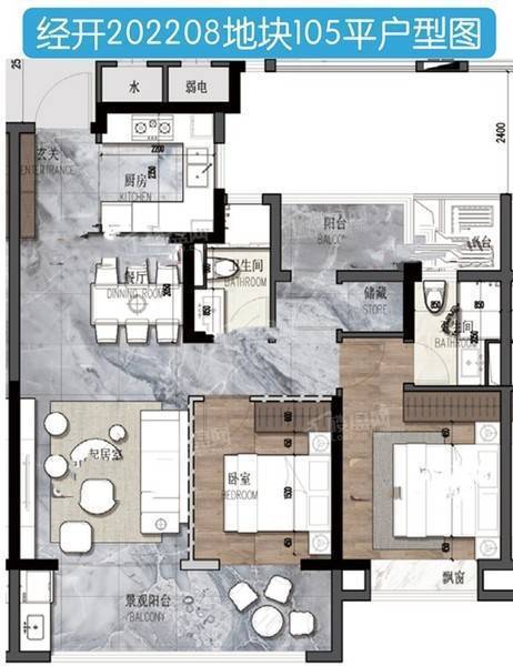 105㎡的两室两厅两卫户型,方正布局,动静分离,功能分区明确。主卧套房设计,独立卫浴,厨房通风式设计,提供舒适的生活空间。无论是居住还是投资,都是不错的选择。