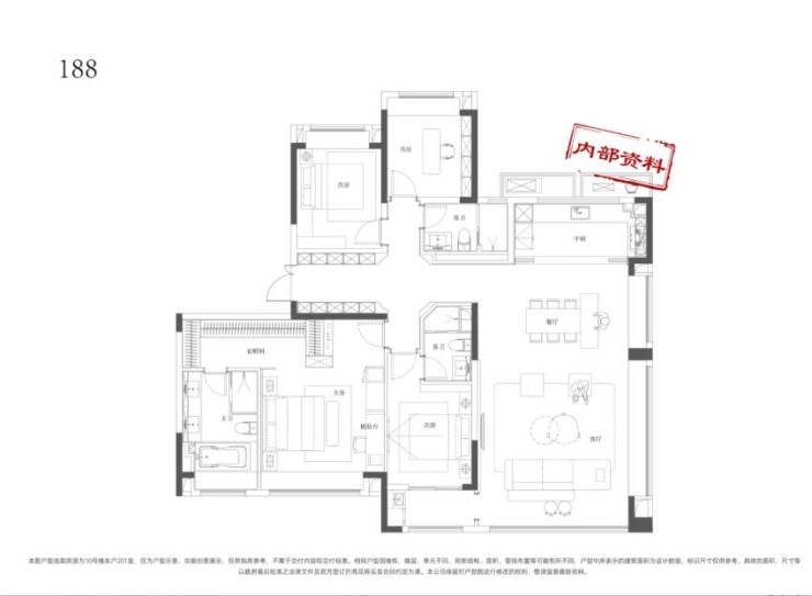 188㎡的户型是项目的亮点,入户十字玄关设计,注重私密性。卧房布局在前面,主次卧均为套房设计,主卧的衣帽间和卫生间空间很大,符合改善型住宅的需求。15米端厅,南边是落地窗,客厅活动区域布局合理,提供了舒适的生活空间。