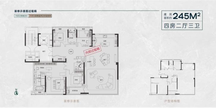 245㎡户型在餐厅区域的旁边还设有一个红酒吧台,厨房和餐厅的间距拉大,玄关边也设置了鞋帽间,该户型至少可设置四间卧室及一个独立的书房或健身房,布局中处处透露着周到细致,功能区域完整。无论是家庭生活还是个人空间需求,都能得到满足。