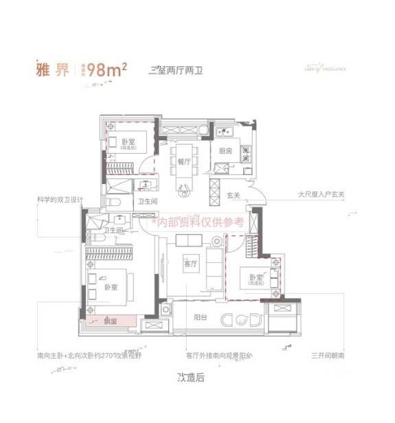 徽创金悦江南郡楼盘的104㎡户型设计精良,结合了实用性与舒适度,是一种典型的大面宽、短进深的户型。该户型主推三房两厅两卫的设计,适合三口之家或二胎家庭居住。
